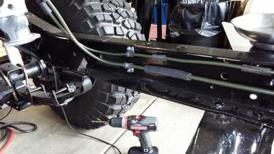 Since the rear brake line and wiring harness already occupied the driver side frame rail, I decided to route the fuel lines along the passenger side frame rail. As I did with the brake lines, I used small clamps with rubber inserts bolted to the frame to secure the lines to the inner frame rail. I took special care to note any locations where the hard lines might contact metal during movement, and sleeved the lines in split rubber hose. This should prevent damage to the fuel lines while jostling around off road.