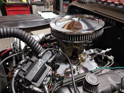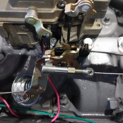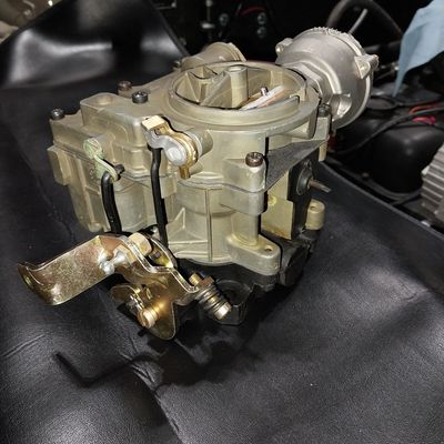 The original Rochester 2-barrel carburetor came with a manual choke and is a pretty simple affair. I bought a quality rebuild kit and power valve and went to work. The internals looked good and I was pleased with the rebuild. My one concern was with the external rods and linkage, including the fast idle screw and choke assembly. Several pieces were bent, a return spring was hosed, and when I began test fitting the throttle cable, things just weren't lining up or fitting well. So I bit the bullet and spent the money for a completely refurbished Rochester 2 Jet with an electronic choke. It came with what looked like brand new rods and linkage, and everything lined up perfectly and adjusted just right. I tucked my original away for spare parts.