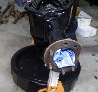 Once the brakes were removed down to the backing plates, I removed the diff cover and drained the gear oil. It was pretty dirty, but there was no sign of water contamination or metal particles - both good signs. After cleaning out the differential with brake cleaner, I found the rear ring and pinion gears to be in excellent shape with no chipped or broken teeth. Since I'd be sticking with the 3.73:1 ratio, this would save me from buying a new ring and pinion set.
